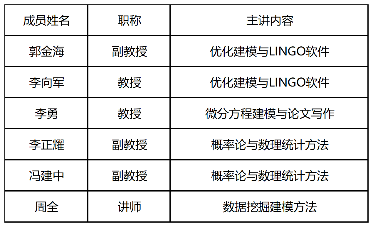 beat365官网数学建模指导教师团队由6名核心教师组成,专业结构合理,经验丰富。团队致力于以赛促学、以赛促教,主要采用“线上线下同步、双校区联动”的教学模式,系统开展数学建模方法、软件应用与论文写作培训,并在暑期组织强化集训,全面提升学生的创新能力和实战水平,带领学生在国内外竞赛中取得优异成绩。