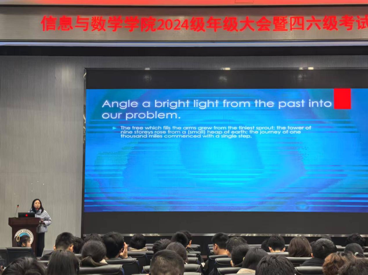 为让同学们更好地掌握备考技巧,大会特别邀请了英语教学经验丰富的何赟老师进行备考指导。何老师结合多年的教学经验和四六级考试命题规律,从听力、阅读、写作、翻译四个方面进行了详细地讲解。她分享了听力练习的有效方法,如精听与泛听相结合、利用真题进行模拟训练等;在阅读方面,提醒同学们要注重阅读技巧的培养,学会快速定位关键信息;对于写作和翻译,她强调了日常积累的重要性,建议同学们多背诵优秀范文和常用表达。