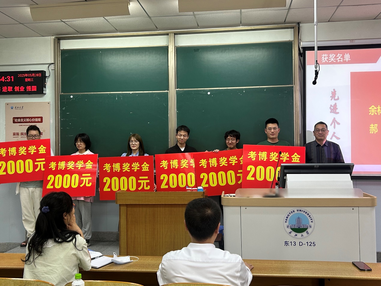 随后,学工办主任姜曼对余林骏等6位考取博士研究生的优秀毕业生进行表彰,由副院长李治教授向每人发放2000元考博奖学金,勉励他们继续勇攀学术高峰。随后,余林骏、湛雅倩和杨沛鑫三位优秀毕业生代表依次上台分享考博经验。他们结合自身备考经历,从目标院校选择、科研能力提升、申请材料准备和面试技巧等维度进行系统讲解,重点强调学术成果积累和导师沟通策略的重要性。整场分享既有理论高度又具实操性,其总结的“早规划、多积累、勤沟通”的备考经验让在场同学受益匪浅。