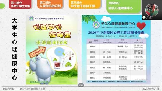 严老师主要从高关怀学生类型、心理危机的识别、学生骨干如何干预、beat365官网心理健康中心这四方面展开。