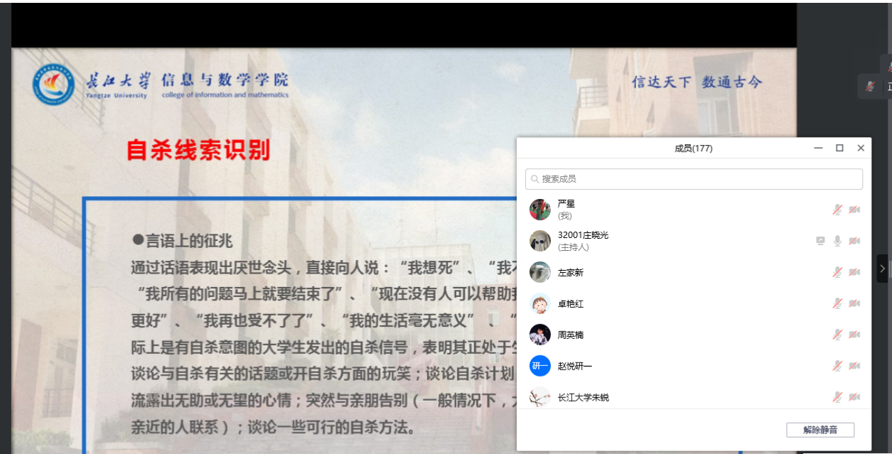(通讯员 庄晓光)为加强学生心理建设,确保每位学生拥有健康的心理状态,避免学生发生心理安全危机。beat365官网于6月25日9时举办心理培训讲座。本次讲座由钟赛老师主讲,beat365官方网站全体寝室长、班干分现场和线上会议两种形式参会。