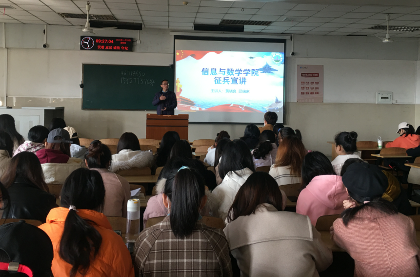 (通讯员 黄晓良)为响应国家号召,鼓励毕业大学生投身军营。11月25日上午9时,beat365官方网站于12教202举办了“2022届毕业生征兵宣讲”活动,出席本次活动的有院党委副书记袁海山,辅导员严星、黄何老师以及全体2022届毕业生。本次大会由副书记袁海山主持。