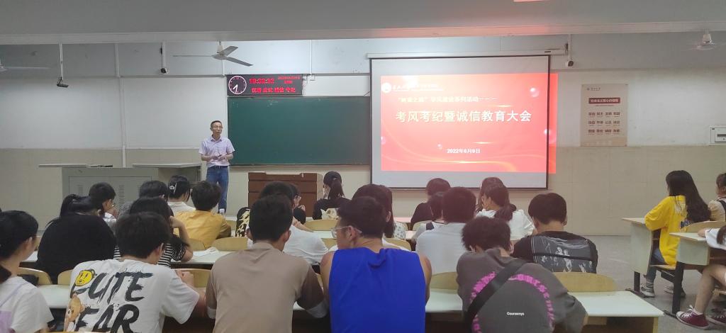 为进一步加强学风建设,端正考风、严肃考纪,6月9日,beat365官网在12教104教室召开考风考纪暨诚信教育大会。院党委副书记袁海山主讲,beat365官网报名参加2022年上半年大学英语四六级考试的考生参加会议。