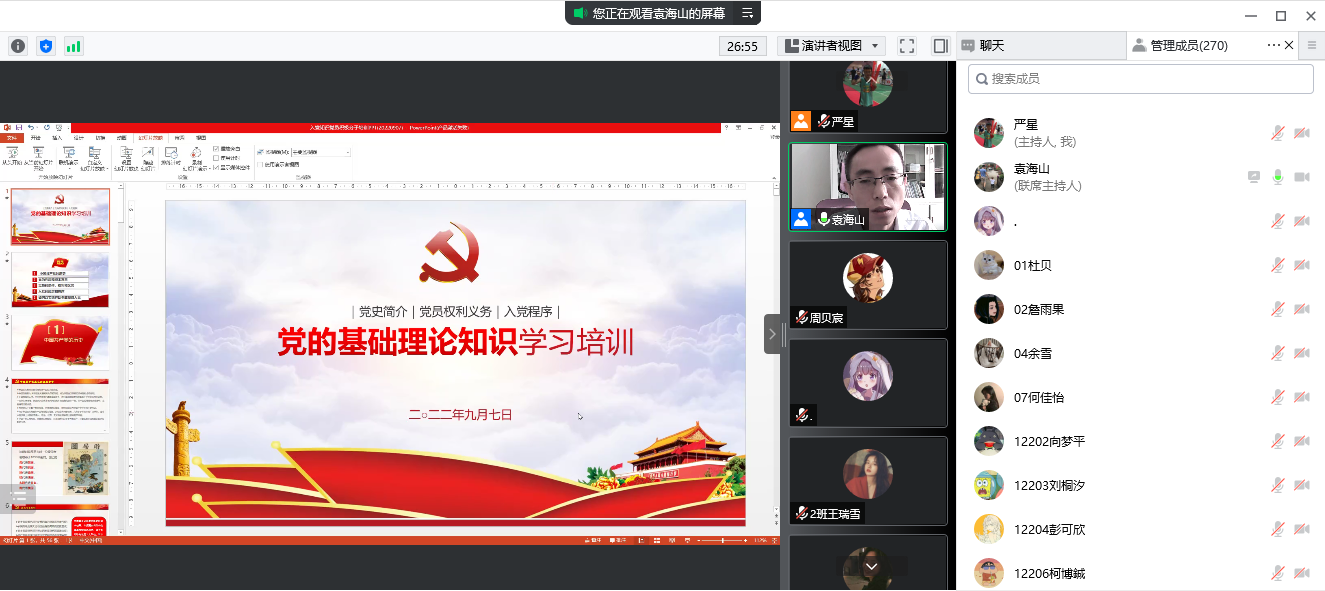 (通讯员 慈永鑫)9月7日下午两点半,beat365官方网站22级全体本科、研究生新生在腾讯会议上了一堂生动的党课。本次课程由学院党委副书记袁海山主讲。