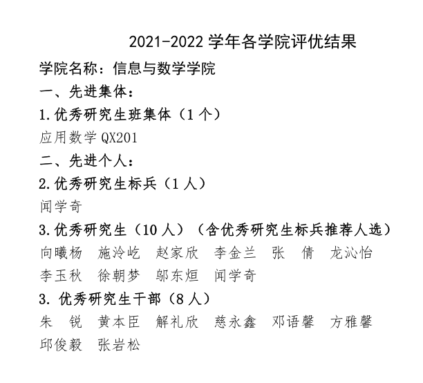 为了树立先进典型,充分发挥典型的教育示范作用,学校研工部决定,评比和表彰一批先进集体、先进个人。经过个人申报,民主评议,院学生事务办公室推荐,学院评审小组审核,现将2021-2022学年研究生工作先进集体和个人评选结果予以公示,具体名单详见附件。 公示时间为:2022年11月29日—12月1日。公示期间,凡对上述评选有意见者,请及时以书面或口头形式向分管学生工作的领导反映。 联系人:袁海山 联系电话:0716-8060378 beat365官方网站学生事务办公室 2022年11月29日