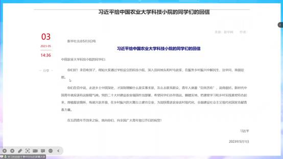 会议开始,主持人向大家朗读了习近平总书记给中国农大科技小院学生的回信,与大家一起共同学习:中国农业大学科技小院的同学们,你们好!来信收到了,得知大家通过学校设立的科技小院,深入田间地头和村屯农家,在服务乡村振兴中解民生、治学问,我很欣慰。你们在信中说,走进乡土中国深处,才深刻理解什么是实事求是、怎么去联系群众,青年人就要“自找苦吃”,说得很好。新时代中国青年就应该有这股精气神。党的二十大对建设农业强国作出部署,希望同学们志存高远、脚踏实地,把课堂学习和乡村实践紧密结合起来,厚植爱农情怀,练就兴农本领,在乡村振兴的大舞台上建功立业,为加快推进农业农村现代化、全面建设社会主义现代化国家贡献青春力量。在五四青年节到来之际,我向你们、向全国广大青年致以节日的祝贺!学习完习近平总书记的回信后,主持人又带领大家一同观看了关于此次回信的相关报道,进一步加深对回信的学习和体悟。