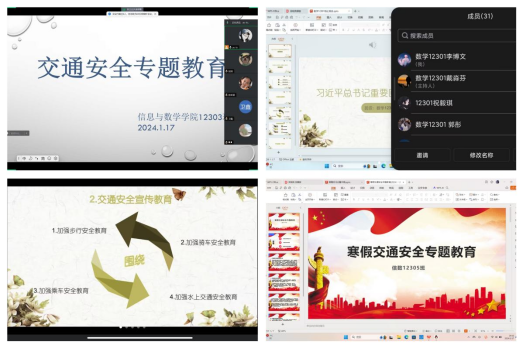 会议中,院学工办主任钟赛汇报了beat365官网学生离校情况,综合分析了寒假及春节面临的交通复杂形势,接着辅导员吴朝晖从交通安全、消防安全、网络安全、预防诈骗、居家安全、谨防溺水、预防自然灾害、公共安全等多个方面对学生进行全方位的安全常识教育。其次,班主任通过线上会议带领同学们认真学习假期安全知识,围绕卫生与健康、用火用电安全、饮食安全、出行安全、平安过节共五个方面,切实加强对同学们的自我防范和自我保护教育,并结合具体案例强调寒假个人出行的防护措施和方法。