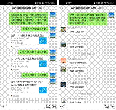 最后,辅导员老师们强调同学们在家养成良好的习惯。吴朝晖老师要求大一学生在家坚持进行自习,加强英语和专业课的学习。黄何老师提醒高年级的大三学生在寒假期间做好考研规划,并准备考研复习。并希望家长们都和学生沟通,家校联合助力学生成长。