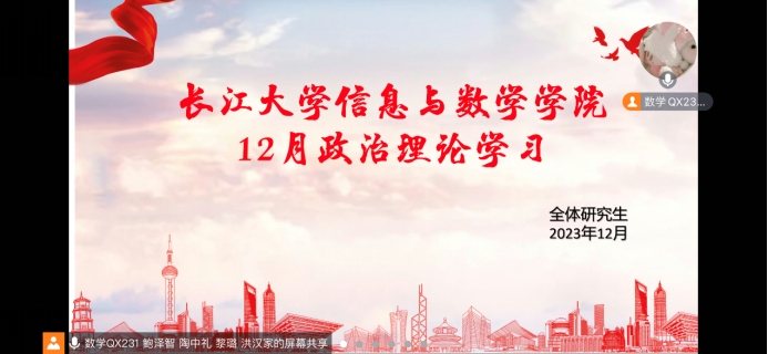 [通讯员 黎璐]为深入学习贯彻党的二十大精神,切实加强学生理论水平,坚定正确的政治方向和理想信念,beat365官方网站于2023年12月20日早10点在线上开展了十二月份政治理论学习。学院全体研究生参与学习,会议由鲍泽智主持。