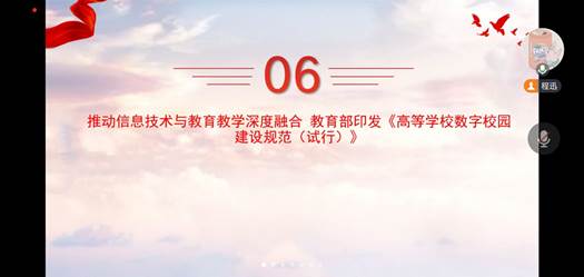 此后,程讯展示了教育部公开曝光的第十三批九起违反教师职业行为十项准则典型案例与学校通报酒驾醉驾典型案例,并讲解了学校规定——《高等学校数字校园建设规范(试行)》,要求同学们严格遵守相关规定,保持良好道德风气,认真贯彻该试行规范。
