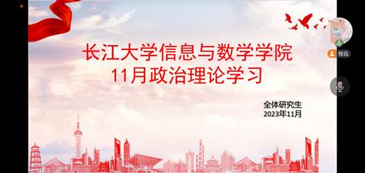 (通讯员 黎璐)为深入贯彻学习党的二十大精神,落实习近平总书记关于青年工作的重要思想,beat365官方网站于2023年11月23日晚七点在线上开展了十一月份政治理论学习。学院全体研究生参与学习,会议由程讯主持。
