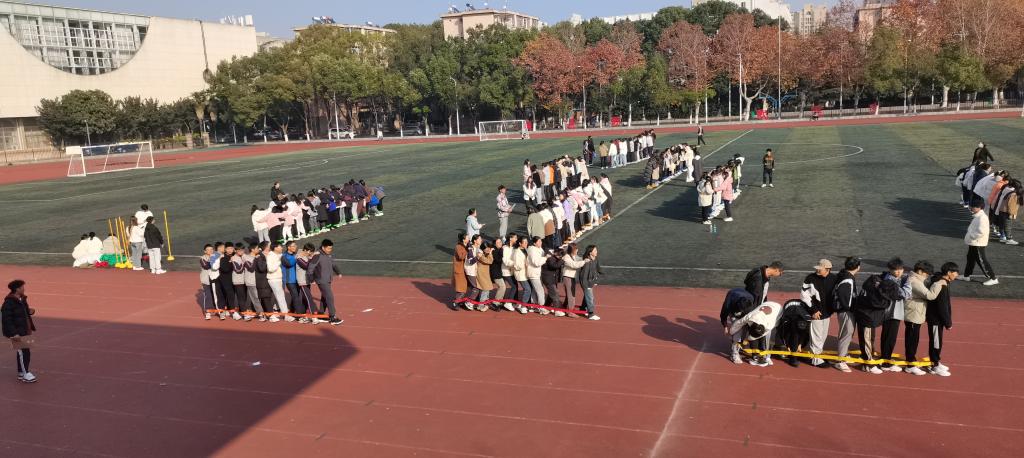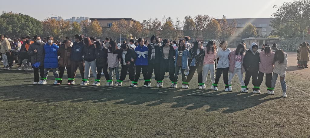 该活动共分为四个环节。第一个项目是十人一组的“巨人的脚步”。团队成员脚捆绑在一起,由指定地点出发并返回。这个项目是一个统一指挥,共同奋进的过程。紧接着是“排山倒海”,大家并肩并交替站成一排,相邻两人的脚用弹性绳绑起来。团队成员需要通过密切的协作和默契的配合来保持步伐的一致性,他们需要共同调整步幅和速度,以避免摔倒或失去平衡。在整个过程中同学们的合作能力得到了进一步的提升。随后是“速度与智慧”,顾名思义,该项目考验同学们的协调能力和反应能力,需要成员在规定时间内接力赛跑并参与答题,场面激烈,气氛火热,堪称一场现实版“速度与激情”。最后,迎来了压轴项目——“全班一条心”,需参与者们分工配合,一部分负责甩绳,一部分负责同时跳八根绳,考验了同学们的团结合作能力,有利于培养班级的凝聚力。