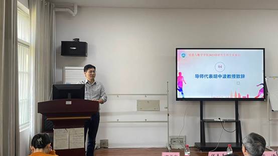 接着,导师代表胡中波老师致辞。他以导师在研究生阶段胜似父亲为引入点,深情地与新生们分享了他多年来在教育领域的经验和感悟。他还提到,研究生阶段是一个探索和成长的时期,不仅要深耕学术,更要培养坚韧的品格。最后就beat365官网研究生毕业生去向做了一定说明结束了致辞。