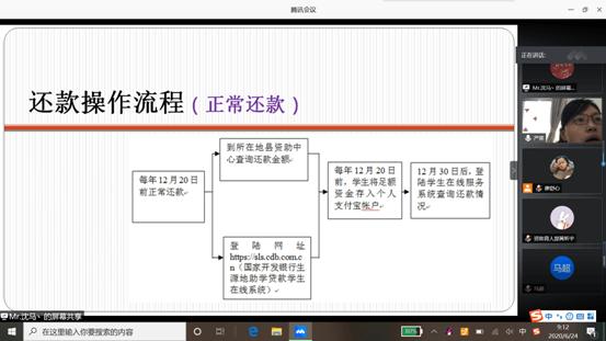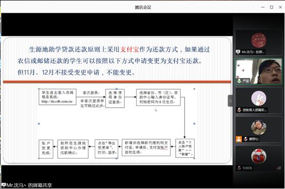 (通讯员 黄昕宇)6月24日上午9时,为帮助beat365官网2020届毕业生了解生源地贷款还款流程。资助专干严星老师在腾讯会议平台上召开2020届毕业生生源地贷款还款流程讲解会,对2020届进行生源地贷款的毕业生详细讲解生源地贷款还款须知。