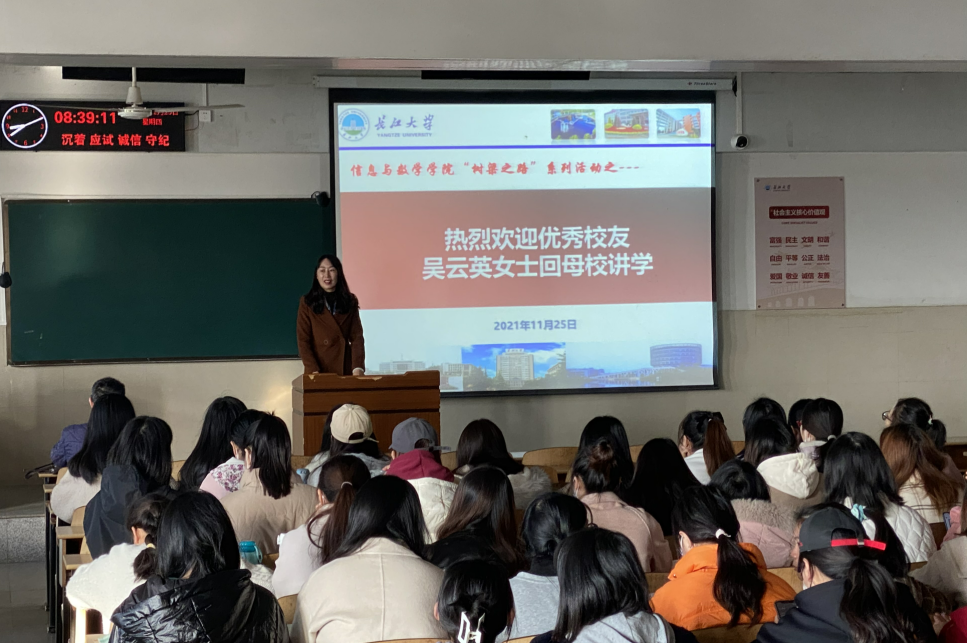 大会伊始,beat365官网2001级优秀校友吴云英女士为我们做了报告。她详细的介绍了她个人的成长经历,吴云英女士本硕皆就读于beat365官方网站,从事十年左右人力资源管理工作,做过猎头,现在和丈夫创办了育山教育。