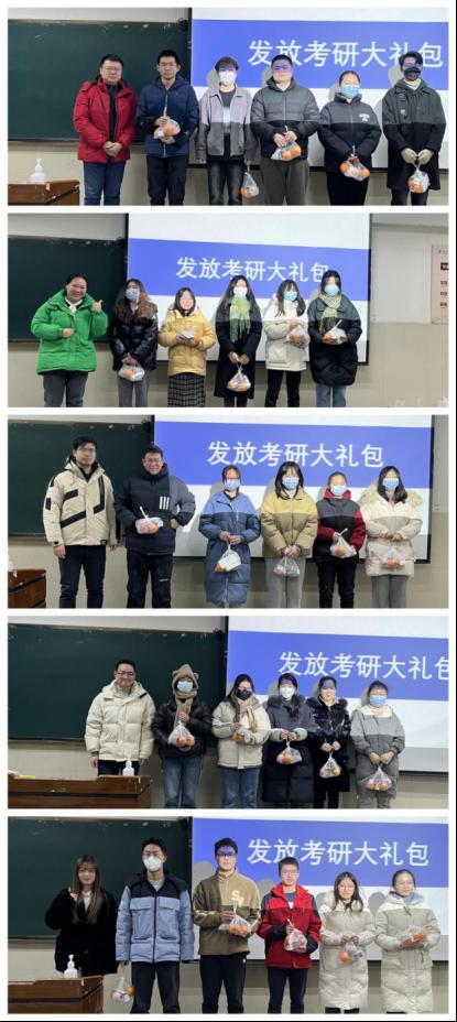 接着,学院领导老师给考研同学发放了考研大礼包。其中有悉心准备的橙子、薯片、红枣、柚子等水果零食,其中饱含了对考研学子的深情祝福:祝愿同学们生活中“乐事无限”“早日上岸”,付出的努力终有收获的“一战成硕”,同时希望同学们在考研最后的阶段坚持不懈,继续“加油”。最后,院党委副书记谷军总结发言。他鼓励同学们坚持到底、决不放弃,要劳逸结合、关注天气变化,以健康的体魄、昂扬的状态迎接最后的挑战!