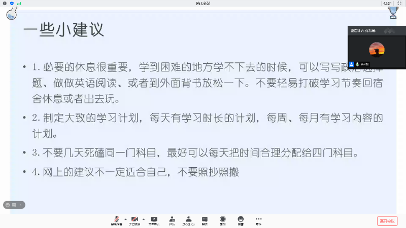 随后,范礼媛同学就择校方面补充道:要从各方面了解考研学校的热度,根据自己的强项去选择不同学校。她在英语备考及政治备考两方面做了详细介绍,表示这两门科目都要尽早的去背诵记忆。最后,会议在严星老师与两位主讲人给同学们答疑解惑中落下帷幕。