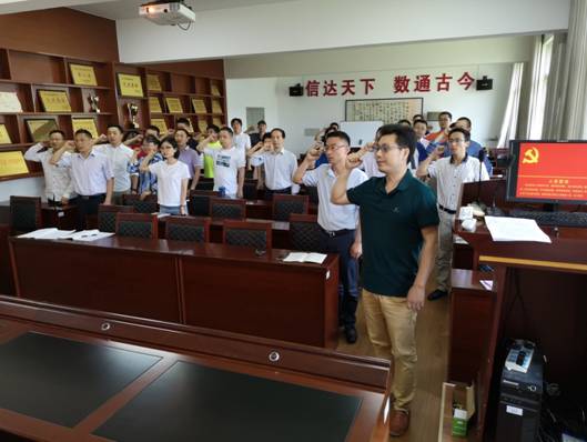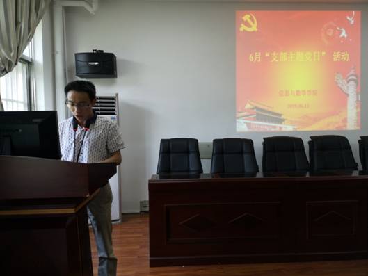 第二阶段,举行6月“支部主题党日”活动。党员全体起立,面向党旗,举起右手,在副院长胡中波领誓下,重温入党誓词。院长吕一兵带领大家一起诵读了党章第二章第十条“党的民主集中制的基本原则”。接着全体党员采取无记名投标方式,对各支部推选的“优秀共产党员”和“优秀党务工作者”候选人进行差额投票,最终数学与应用系教工党支部李向军老师、应用统计系教工党支部李勇老师被作为“优秀共产党员”候选人、党建秘书卜富清作为“优秀党务工作者”候选人上报学校党委。随后,以党支部为单位开展了以“爱校”为主题的讨论活动。最后党员按要求缴纳了6月党费。