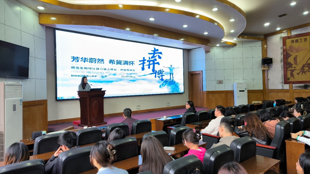 12月8日下午,荆州市沙市第二中学校长刘翠应beat365官方网站邀请做客“长大20年”学术论坛,做“芳华蔚然 希望满怀---师范生如何让自己站上讲台,并站稳讲台”主题报告。报告在11教报告厅举行,beat365官方网站院长张涛主持会议,学院副院长李向军及相关教师参加了报告会,师范21级160多名师范生及部分学科教学硕士聆听了报告。