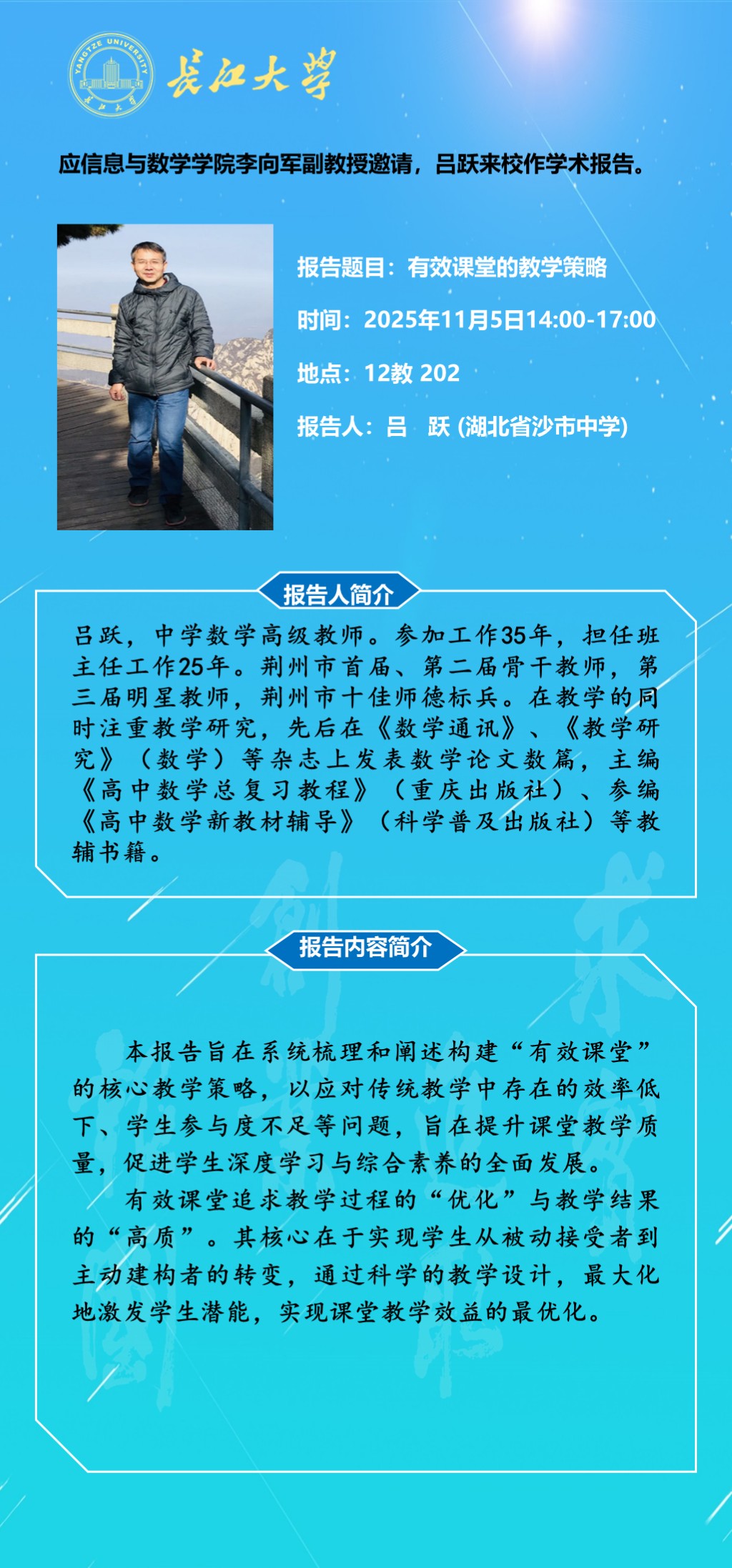 报告人 吕 跃 (湖北省沙市中学) 报告时间 2025年11月5日14:00-17:00