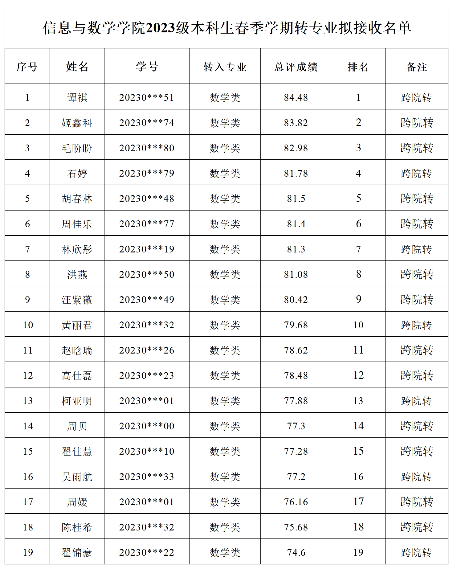 根据《beat365官方网站普通本科生专业分流与转专业管理办法(试行)》(长大校发〔2019〕260号)精神,按照《关于开展2023级普通本科生春季学期转专业工作的通知》和《beat365官方网站2023级普通本科生转专业考核工作方案》要求,经学生本人申请,学生所在学院和本科生院资格审核,beat365官网对拟转入学生进行了面试考核。现将beat365官方网站2023级本科生春季学期转专业拟接收名单予以公示。