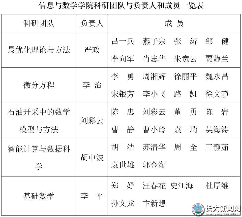二十年来,信数学院以问题和需求为导向,全面提升高水平科学研究能力。学院以服务学校“双一流”建设、提升自身整体科研水平为切入点,深入挖掘和整合全院科研力量,形成了符合自身学科发展规律的科研特色与优势,结合学院现有的科研方向以及人才队伍的基本结构状况,组建了五个科研团队。