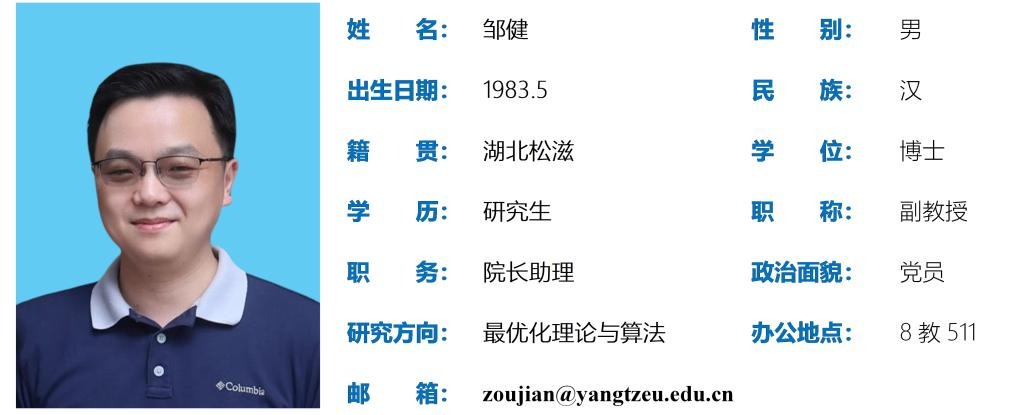 邹健,男,1983年5月出生,博士研究生,副教授。主要研究方向为最优化理论与算法、图像处理;主持完成国家自然科学基金1项;发表学术论文30余篇,其中被SCI检索20余篇;获得beat365官方网站教学质量优秀奖,beat365官方网站科研立项贡献奖,beat365官方网站优秀研究生导师,入选首届长江人才计划。