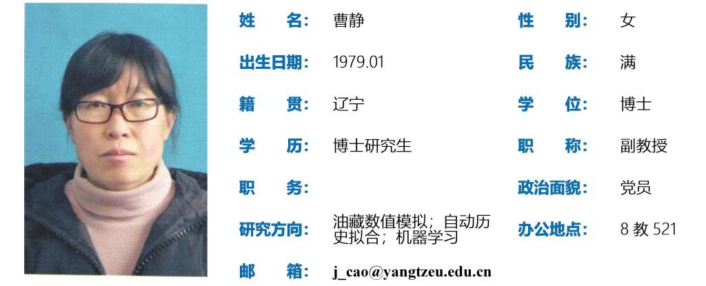 曹静,女,1979年1月出生,博士研究生,副教授。主要研究方向油藏数值模拟、自动历史拟合、机器学习;主持国家青年基金项目1项;发表学术论文10余篇。