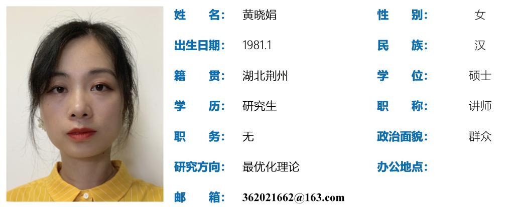 黄晓娟,女,生于1981年1月,硕士,讲师,主要研究生方向为最优化理论,获beat365官方网站青年教师讲课比赛一等奖1项,三等奖1项,发表学术论文8篇,指导湖北省高校师范专业教学技能大赛获一等奖3项、二等奖2项。
