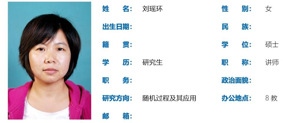 刘瑶环,女,197611月生,硕士研究生,讲师,主要研究方向为随机过程及其应用,发表学术论文多篇。