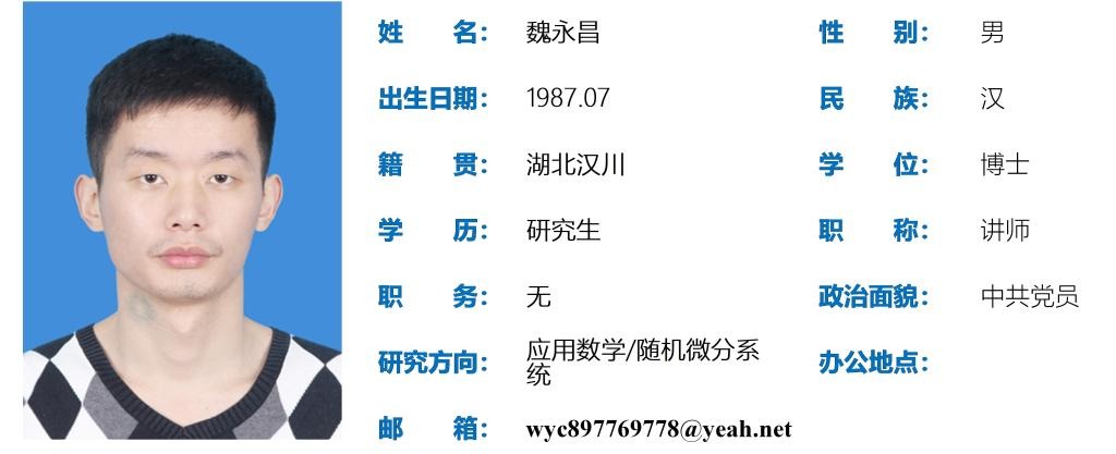 魏永昌,男,1987年07月出生,博士研究生,讲师。主要从考虑确定性系统受不连续型噪声扰动的复杂动力学行为、随机微分方程及随机动力系统等问题,主要从事随机分叉、随机吸引子和随机Lyapunov指数及其应用的教学与研究工作。2018年博士毕业于华南理工大学。参与多项研究课题,具有良好的团队合作精神。公开发表科研论文9篇 ,被SCI收录9篇。